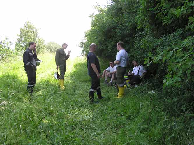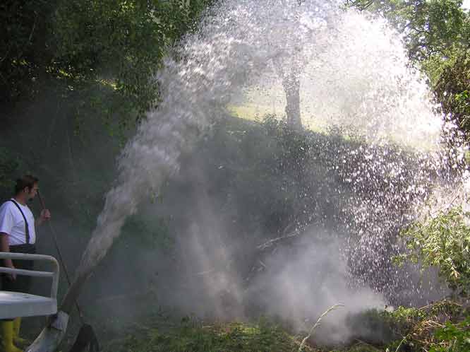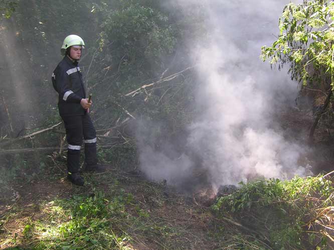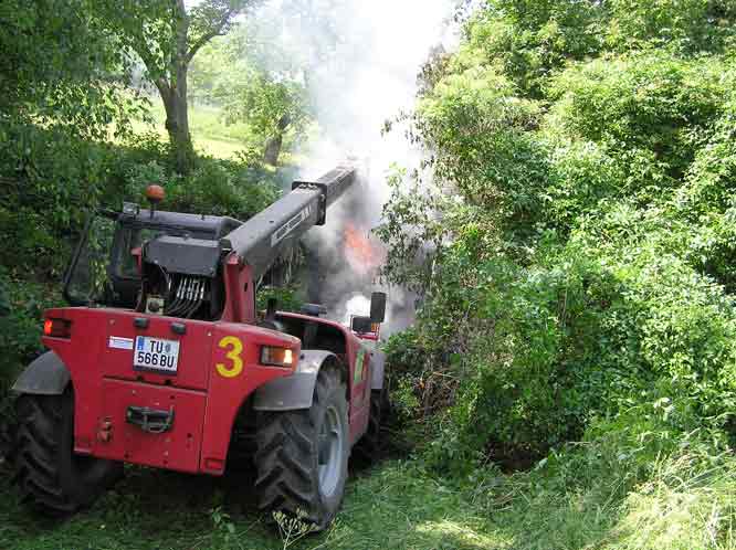 Die schwer zugängliche Brandstelle lag am Waldhang, ein Teleskoplader wurde eingesetzt um einen Weg durch das dichte Gestrüpp zum Brandort freizumachen. Erschwert wurde die Situation durch den steilen Zufahrtsweg. Die Brandbekämpfung erfolgte mittels eines Vakumfasses (10.000 Liter Fassungsvermögen).
