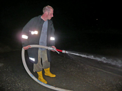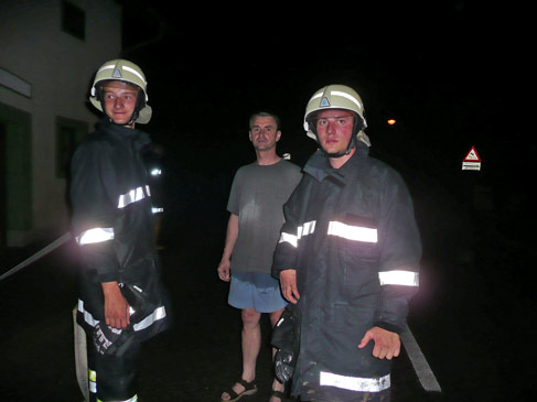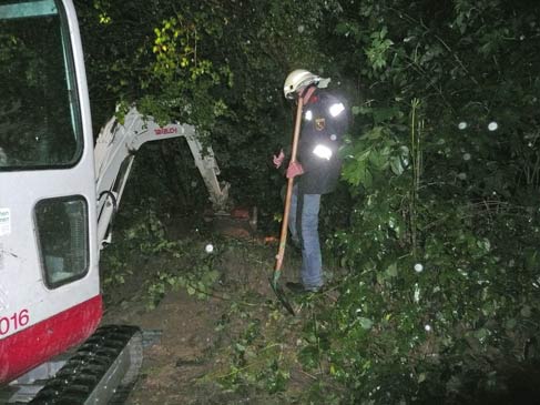 Bei starken Regen, Wind und Dunkelheit wurde gleichzeitig an verschiedenen Stellen gearbeitet. Behelfsmässig wurde das Bachbett wieder saniert, der Sturm hatte auch große Löcher in das Dach der Familie König gerissen. Durch die hohe Zahl der Feuerwehrmänner konnte auch noch in der selben Nacht das Dach eingedeckt werden.