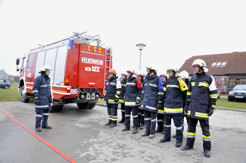 Bei der theoretischen Prüfung müssen die Feuerwehrmänner die Position von Einsatzgerätschaften auf wenige Zentimeter genau bei geschlossenem Geräteraum bestimmen können.