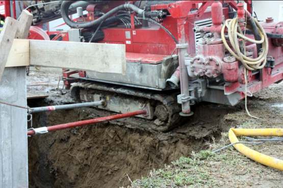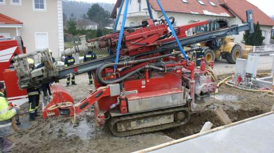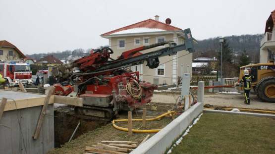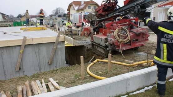Technischer Einsatz am 02.04.2013 um 14:43 Uhr in Pixendorf. Auf einer Baustelle in der Teichgasse war eine Fachfirma beschäftigt zwei Tiefenbohrungen durchzuführen. Nachdem die erste Bohrung abgeschlossen war, wollte der Maschinenführer die Position des zweiten Bohrloches anfahren. Dabei geriet er mit der Raupe des Fahrwerkes der über 10 Tonnen schweren Baumaschine zu nahe an die Baugrube, wodurch der Untergrund nachgab und diese in die Baugrube zu stürzen drohte.