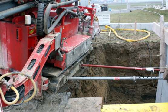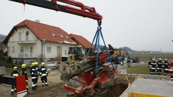 Nach einer kurzen Lagebesprechung konnte mit dem Kran das gesicherte Tiefbohrgerät soweit angehoben werden, dass es mittels eigenem Antrieb wieder zurück auf festen Untergrund bewegt werden konnte.