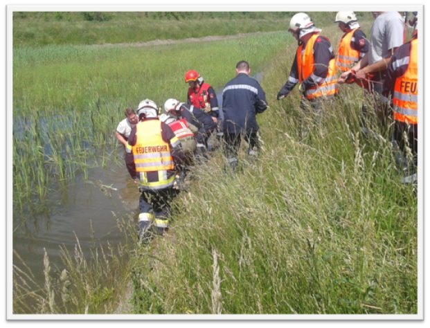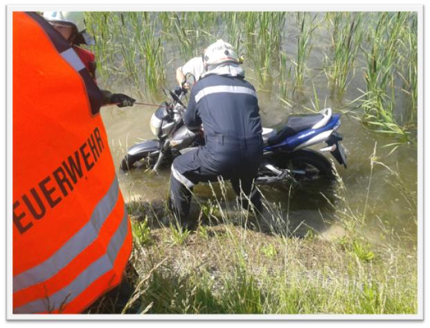 Nach kurzem Informationsaustausch mit der FF Katzelsdorf bargen wir gemeinsam das Motorrad aus dem Entlastungsbecken.