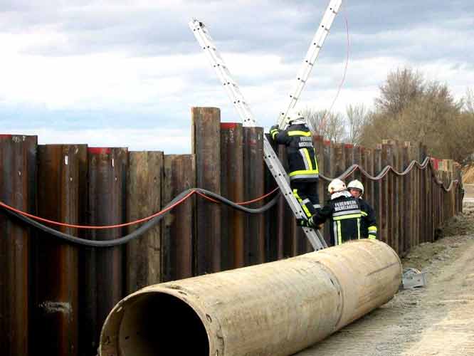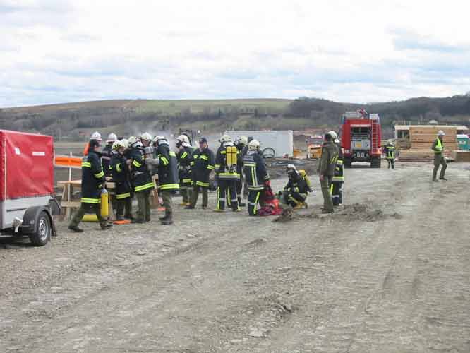 Über Funk und Lotsen wurden die acht Einsatzfahrzeuge mit insgesamt 50 Mann zur Baustelle der HL-Bahn dirigiert, was später von Abschnittsbearbeiter Hannes Diemt mit lobenden Worten bedacht wurde.