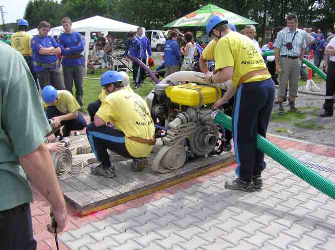 Ähnlich einem Le Monte Start laufen die Starter aus ca. 5 Meter Entfernung zur Tragkraftspritze (TS), legen die 2 Sauger von dem Wasserbottich zur TS, starten die TS und der Maschinist lässt die TS auf Hochtouren laufen - der Angriff läuft gleichzeitig mit den Schläuchen nach vor um dem nachfolgendem Wasser im Schlauch zu "entgehen" und ins Ziel zu spritzen. Beste Zeitnehmung: 17,75 sec.